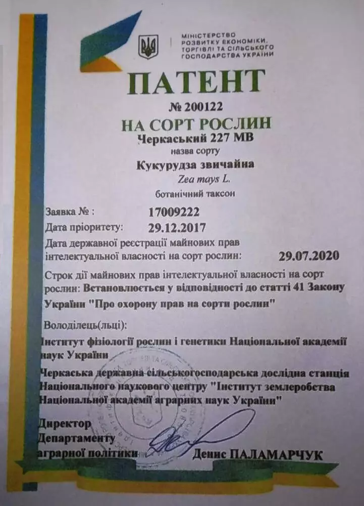 Патент № 1700922 на сорт рослин Кукурудза звичайна Черкаський