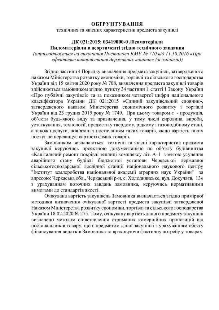 Замовником визначаються технічні та якісні характеристик предмета закупівлі керуючись проектною документацією по об’єкту будівництва «Капітальний ремонт покрівлі теплиці комплексу літ. А-1 з метою усунення аварійного стану будівлі бюджетної установи Черкаської державної сільськогосподарської дослідної станції національного наукового центру "Інститут землеробства національної академії аграрних наук України" за адресою: Черкаська обл., Черкаський р-н, с. Холоднянське, вул. Докучаєв, 13» з урахуванням поточних завдань замовника, керуючись нормативними вимогами до стандартів якості.