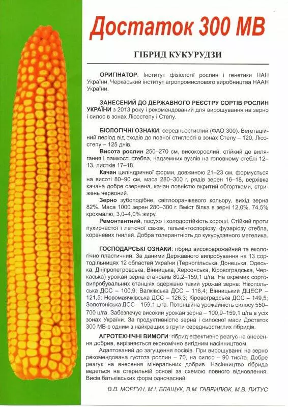 ГІБРИД КУКУРУДЗИ ДОСТАТОК 300 МВ